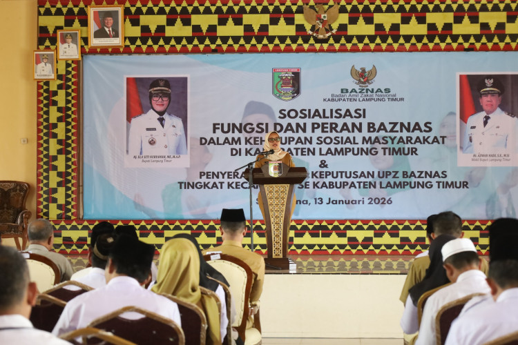 Lampung Timur (KOMDIGI LAMTIM) – Bupati Lampung Timur, Ela Siti Nuryamah, menegaskan pentingnya peran Unit Pengumpul Zakat (UPZ) tingkat kecamatan sebagai ujung tombak pengelolaan zakat yang profesional, transparan, dan tepat sasaran. Hal tersebut disampaikannya saat memberikan sambutan dalam Penyerahan Surat Keputusan Badan Amil Zakat Nasional (BAZNAS) Kabupaten Lampung Timur tentang UPZ Tingkat Kecamatan se-Kabupaten Lampung Timur, yang berlangsung di Aula Rumah Dinas Bupati Lampung Timur, Selasa (13/01/2026).
