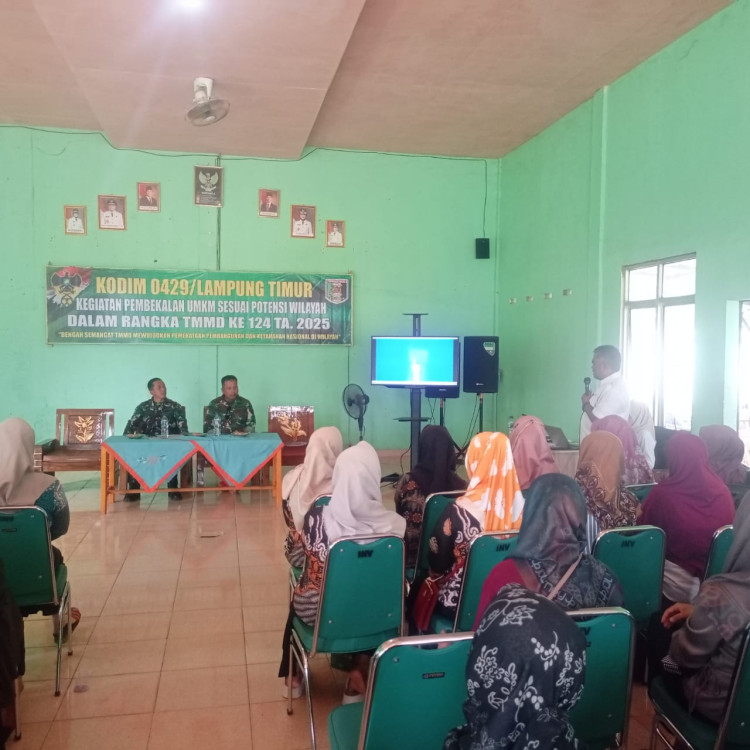 MEDIA CENTER KODIM - Gandeng Dinas Koperasi dan Usaha Mikro, Kecil, dan Menengah (UMKM), Satgas TMMD ke-124 menggelar sosialisasi untuk mendorong potensi wilayah menjadi lebih maju, bertempat di Balai Desa Itik Rendai, Kecamatan Melinting, Kabupaten Lampung Timur, Kamis (22/5/2025).