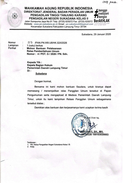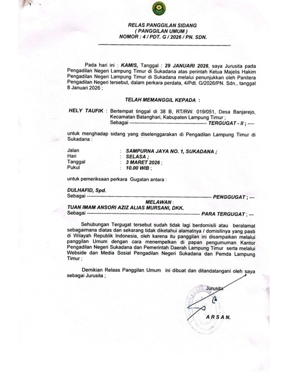 RELAS PANGGILAN SIDANG PENGADILAN UMUM Nomor : 4/PDT.G/2026/PN.MGL