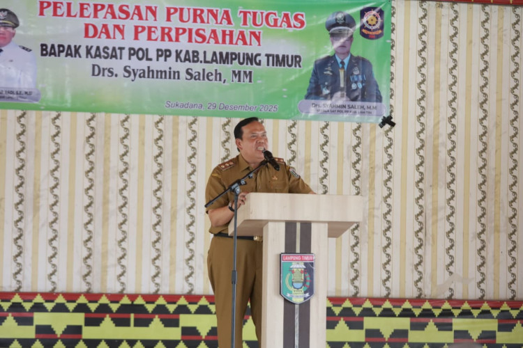 Sukadana (KOMDIGI LAMTIM) - Pemerintah Kabupaten Lampung Timur menggelar acara Pelepasan Purna Tugas Kepala Satuan Polisi Pamong Praja (Kasat Pol PP) yang dirangkaikan dengan perpisahan Drs. Syahmin Saleh, M.M., berlangsung di Aula Rumah Dinas Bupati Lampung Timur, Senin (29/12/2025). Acara berlangsung khidmat dan penuh suasana haru.