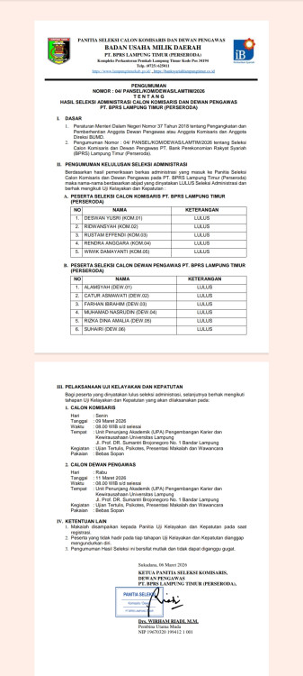 PENGUMUMAN HASIL SELEKSI ADMINISTRASI CALON KOMISARIS DAN DEWAN PENGAWAS PT. BPRS LAMPUNG TIMUR (PERSERODA)