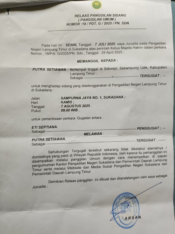 RELAAS PANGGILAN SIDANG(PENGADILAN UMUM) NOMOR :18/PDT.G/2025/PN.SDN