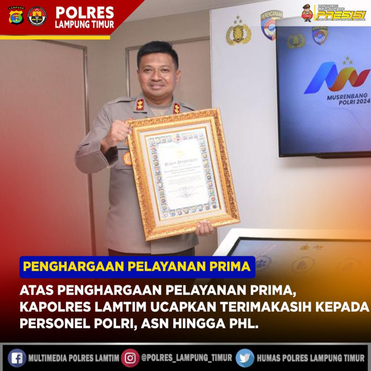 Lampung Timur (KOMINFO LAMTIM) - Polres Lamtim Terima Penghargaan Dari Kapolri Sebagai Unit Pelayanan Publik Hasil Pemantauan Dan Evaluasi Kinerja Penyelenggara Pelayanan Publik Instansional Di Lingkungan Polri T.A. 2023 Kategori Pelayanan Prima (A).