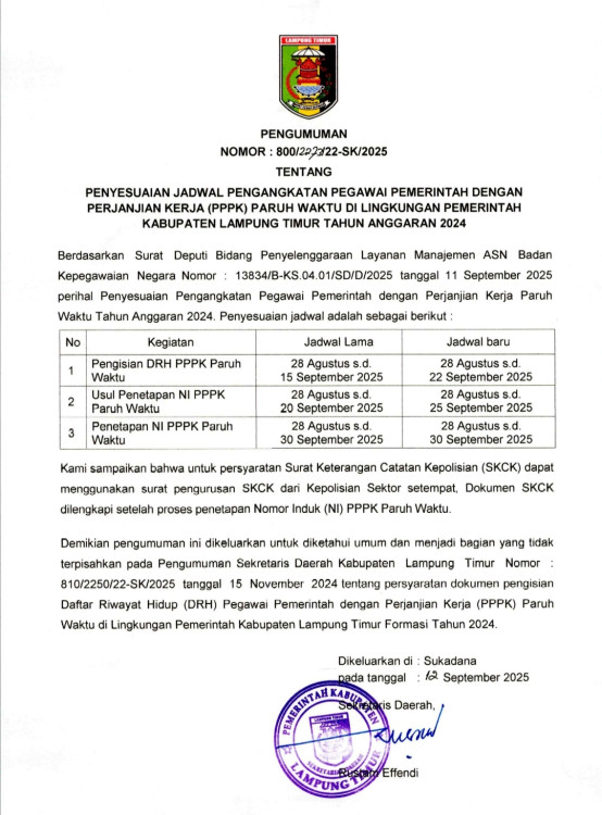 JADWAL PENGANGKATAN PEGAWAI PEMERINTAH DENGAN PERJANJIAN KERJA (PPPK) PARUH WAKTU DI LINGKUNGAN PEMERINTAH KABUPATEN LAMPUNG TIMUR TAHUN ANGGARAN 2024