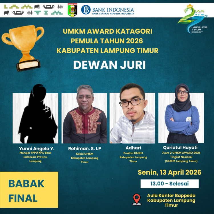 Pada hari Senin, 13 April 2026, Dinas Koperasi, UKM dan Tenaga Kerja Kabupaten Lampung Timur akan menyelenggarakan Babak Final UMKM Award Katagori Pemula Tahun 2026 bertempat di Aula Kantor Bappeda Kabupaten Lampung Timur. Acara ini merupakan bagian dari rangkaian kegiatan peringatan Hari Jadi ke-27 Kabupaten Lampung Timur, sekaligus menjadi wadah apresiasi dan pembinaan bagi pelaku usaha mikro, kecil, dan menengah (UMKM) pemula di daerah.