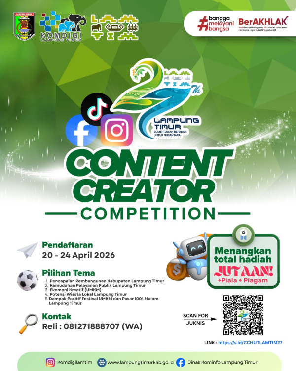 Lampung Timur (KOMDIGI LAMTIM) – Dalam rangka memeriahkan peringatan Hari Ulang Tahun (HUT) Kabupaten Lampung Timur ke-27, Pemerintah Kabupaten Lampung Timur melalui Dinas Komunikasi dan Digital (Komdigi) menggelar Lomba Konten Kreator yang terbuka untuk umum. Kegiatan ini menjadi wadah bagi masyarakat, khususnya generasi muda dan pelaku kreatif digital, untuk menyalurkan ide dan kreativitas dalam mempromosikan potensi daerah.