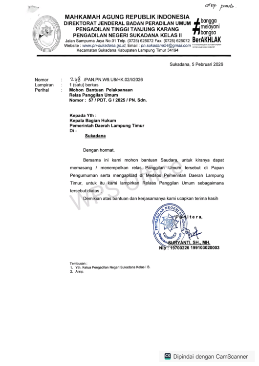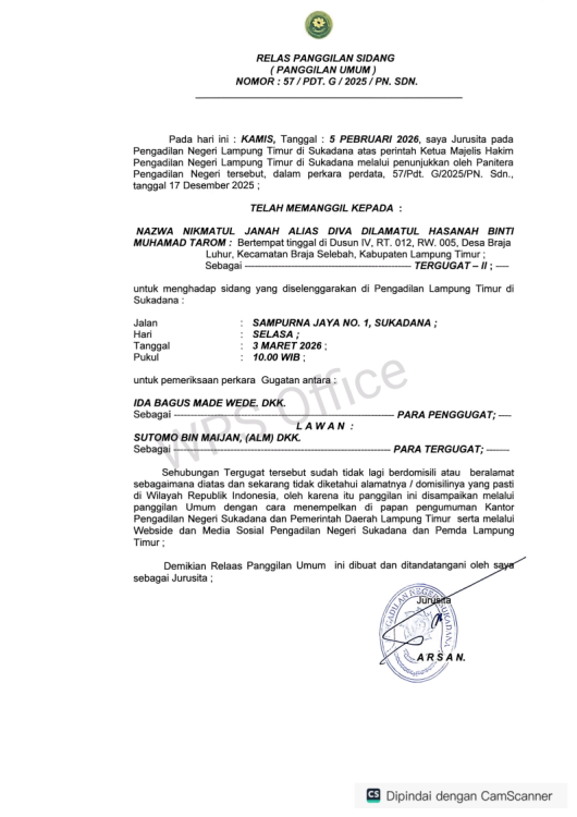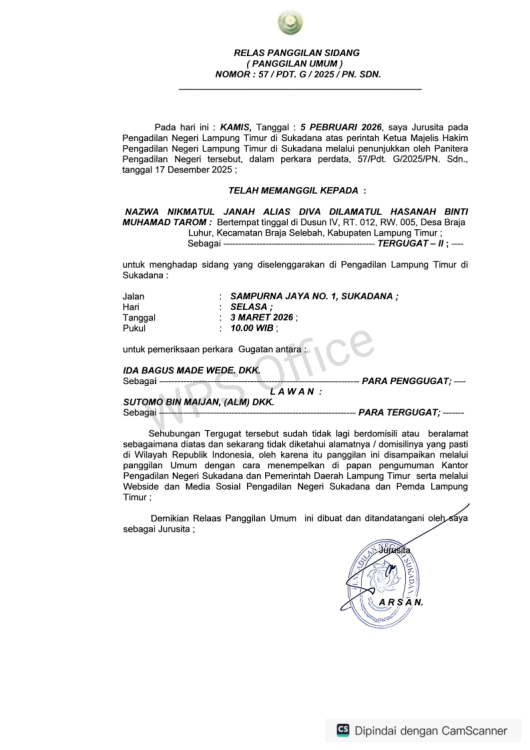 RELAS PANGGILAN SIDANG PENGADILAN UMUM Nomor : 57/PDT.G/2025/PN.SDN